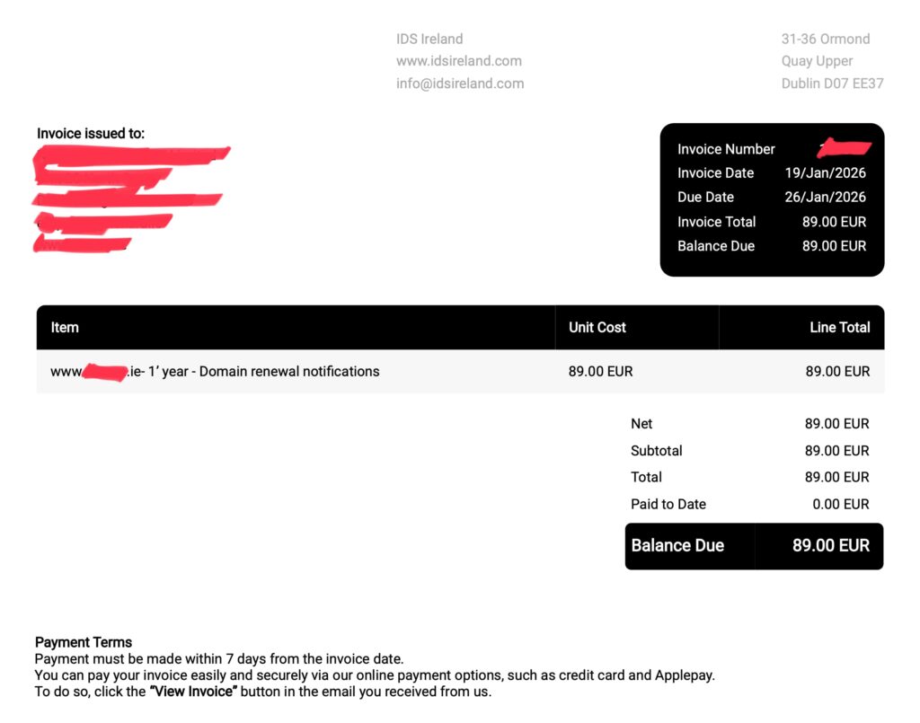 Back in 2019 there was quite a bit of attention on a crowd targeting both Irish and other European businesses with fake renewal notices. They started out under the moniker of “DNS Ireland” but then morphed into “IDS Ireland”